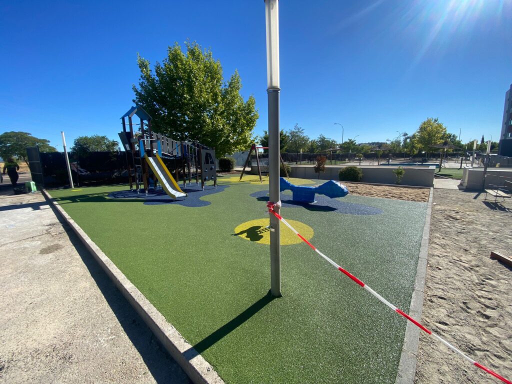 Cómo pavimento amortiguador hemos empleado un diseño atractivo de caucho continuo de colores.